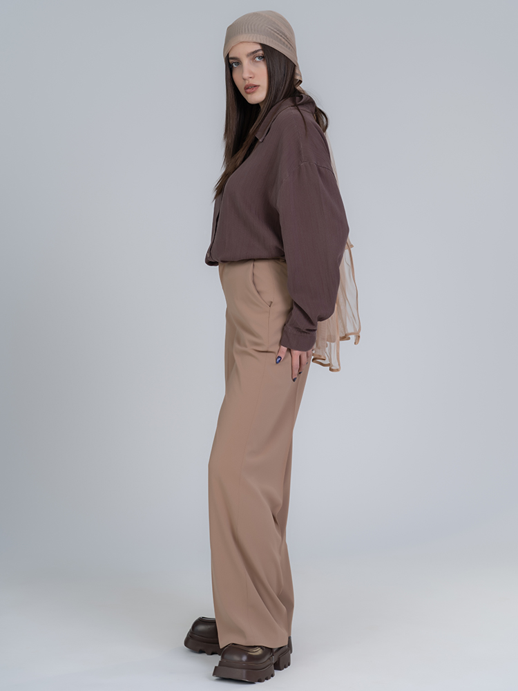 برش بگ در ناحیه ران و پاچههای پهن آزادی حرکت بیشتری فراهم میآورد و سیلوئتی معاصر و راحت میسازد؛ قد 110 جلوهای چشمگیر و کشیده ایجاد میکند که میتواند ترکیبهای متنوعی با بالاتنهها بسازد. رنگ نسکافهای پایهای و گرم است که بهراحتی با پالتهای رنگی مختلف هماهنگ میشود.