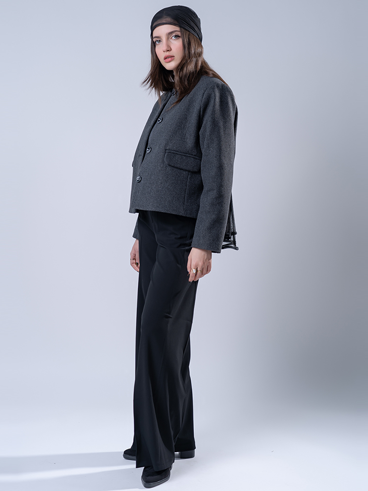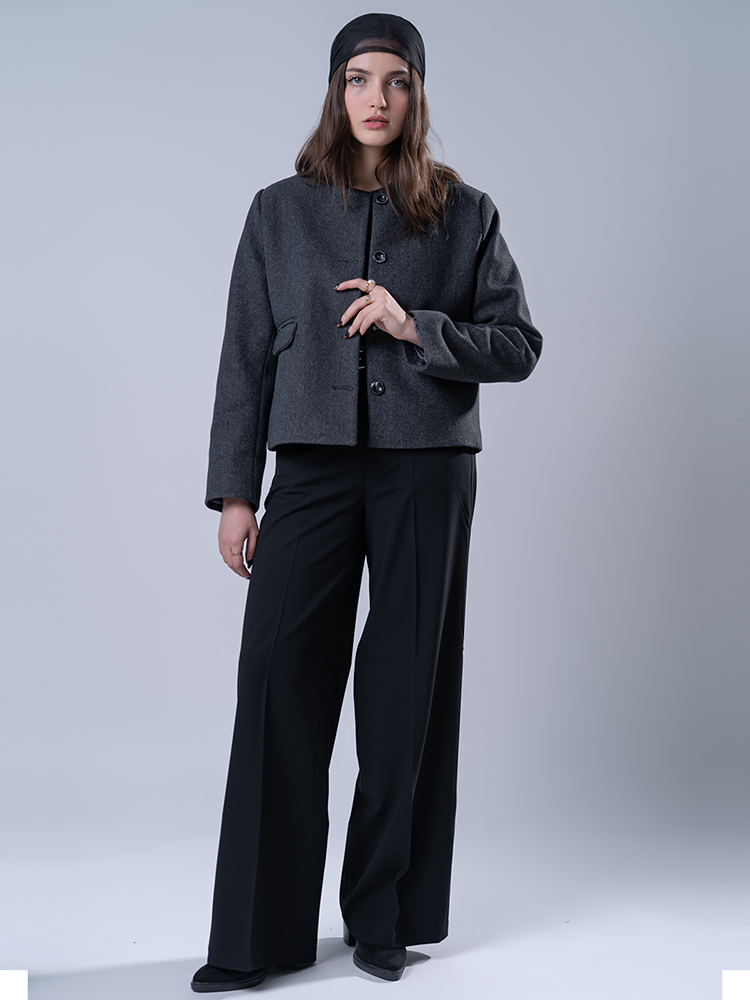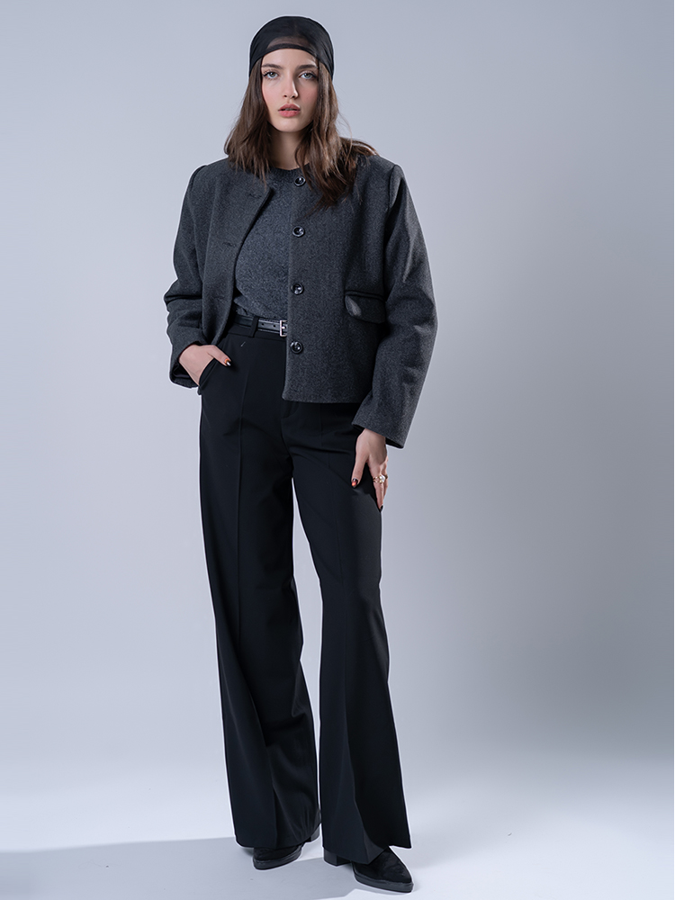 ساختار مدل کد ۲۲۷۱۲، تجسم عینی برش فول بگ است. طراحی از یک خط کمر مشخص آغاز میشود و بلافاصله با گشادی و حجمی چشمگیر در ناحیه باسن و بالای ران گسترده میشود. این حجم، عمدی و کاملاً مد روز است. سپس، طراحی به تدریج به سمت پایین کنترل شده و در دمپا به فرمی باریک و ساختاریافته میرسد. این تضاد بین حجم بالا و ساختار پایین، خالق ظاهری مجسمهوار و خیرهکننده است.